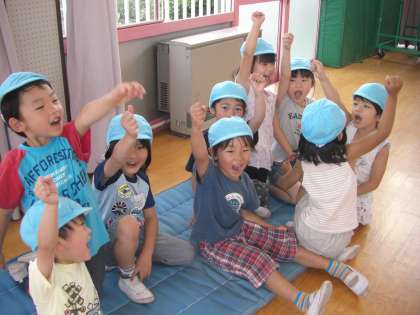 ゆり組(5歳児)は,今,帽子取りをしています。今までは好きな色の帽子をかぶりどの帽子もとってよかったのですが,カラー帽子の色でチームに分かれました。ピンク,青,緑の3チームです。自分以外のチームの帽子ならとってOKです。今はどのチームの人数が多いか少ないかもあまり意識することなく,友達と一緒のチームということに喜びを感じ,帽子を取られたら,友達を一生懸命応援しています。ただ,「先生がチームに入ると先生は背が高いので帽子が取れないし先生がチームに入っているところと入っていないところがあるのはおかしい」「先生がチームに一人ずつ入ってほしい」などの意見が出ていました。これからどんなルールが決まっていくのでしょうか。子どもたちが話し合って決めていきますので,今後もゆり組み帽子取りについて見守っていき,ルールを守って帽子取りを楽しむ子どもたちの姿をお知らせしていきます。
