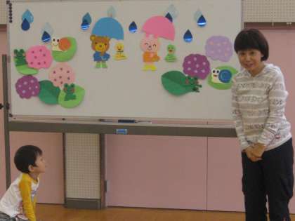 今日は6月生まれの誕生会でした。かわいいくまさんとニコニコうさぎさんは梅雨の雨が晴れるようにてるてるぼうずをかさにつけています。