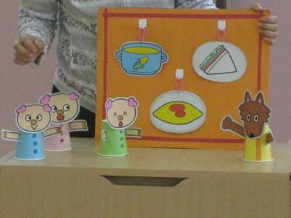 パンやさんスープやさんとレストランの3匹の子豚がだしたクイズに答えれられなかったおなかのすいたおおかみさんに食事をプレゼントするお話をききました。やさしいきもちを育てるお話でした。
