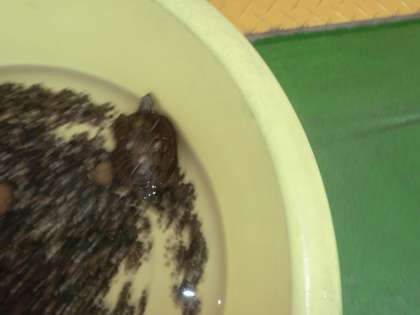 夏休み中の幼稚園では,亀やウサギが元気にしています。残念ながらゆり組(5歳児)で飼育していたザリガニは脱皮がうまくいかず2匹とも死んでしまいました。写真はさくら組(4歳児)大事に育てている「クルクルちゃん」(かめ)です。