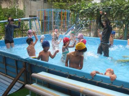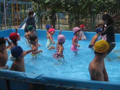 登園日のプールでさくら組(年少組)水しぶきいっぱいです。顔にかかっても大丈夫になった子どもがいっぱい・・・。頼もしいですね。