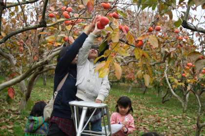 あたり一面の柿の実がなる様子に子どもたちも大喜び。「どれにしようかな?」「あれもおっきくて真っ赤でおいしそう。」と迷いながら気に入った柿を収穫しました。