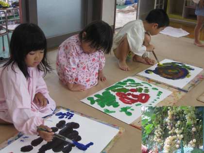 幼稚園には、今、たくさんのブドウができています。4歳児がブドウを食べて絵を描きました。ブドウには種がいっぱい入っているね。レモンよりすっぱいブドウもあるよ。などのお話をしながら絵を描いていました。
