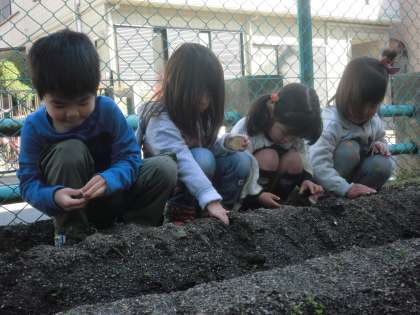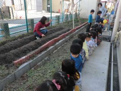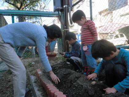 今日はさくら組と一緒にジャガイモの種芋を植えてくださいました。来年みんながゆり組になったらおいしいジャガイモができるでしょう。楽しみです。