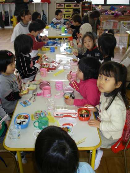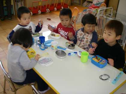 今日は,初めてのお弁当日です。「早くお弁当食べたいなぁ」とみんな楽しみにしています。お弁当の中には,小さなおにぎりが入っていたり,子どもたちの大好きなウインナーが入っていたり,ハート型の玉子焼きが入っていたりしていました。