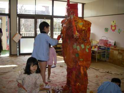 明日から,園内展がはじまります。一人一人のかいたりつくったりした作品を展示します。5歳児は,友達と協力して大きな鬼や一人一人の鬼のお面をつくったり,4歳児は,忍者ごっこで遊んでいる生活から,自分の分身の忍者をつくったりしました。