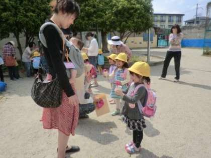 ゆり組(5歳児)が,プレゼントを渡すまで,お家の人には目をつぶっていてほしい・・・と考えました。それを聞いていたさくら組の子どもたちも「お母さんに(目をつぶっててって)言ってきて」とお願いされました。4歳児は友達との内緒ごとが好きになる年齢でもあり,お母さんに内緒でプレゼントを渡すことにとても興味があったのです。ます。実は子どもたちとお母さんの距離はもうすでに10メートルもなかったのです。お母さんたちは当然子どもたちが何か持ってくることは十分わかっていました。