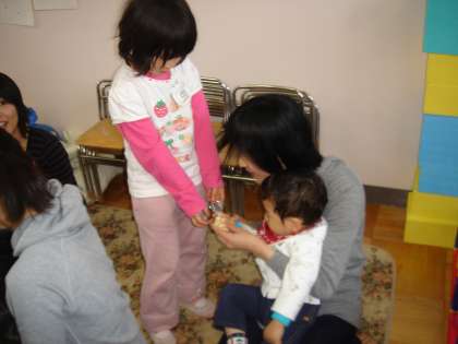 ぽかぽかと外はいい天気で,未就園児の子どもたちも,在園児に混じって砂遊びを楽しんでいます。