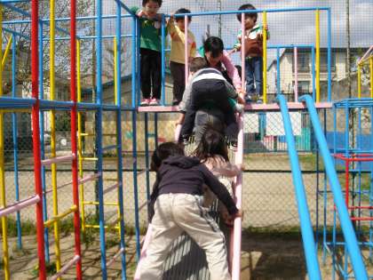 「おーいこっちだよ」「落ちる落ちる〜」と友達の手を引いては滑り,ジャングルジムも大人気です。自分の足と手で力いっぱい踏ん張って,一番上に上がれたことを喜んでいるようです。