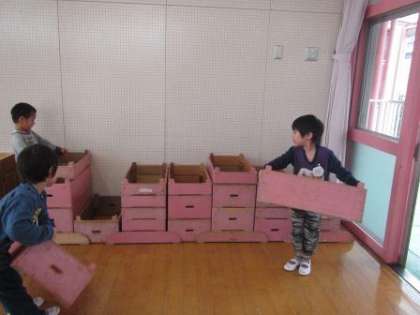始業式,入園式が終わり,遊戯室に巧技台や積み木がゆり組(5歳児)の手で運び込まれました。みんなとても力持ちになっていました。巧技台は同じ高さになるように,考えて置きました。