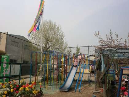 良いお天気になりました。幼稚園の庭にはこいのぼりとちゅうりっぷ,桜の花,元気に遊ぶ子どもたち・・・・4月の幼稚園らしい風景になりました。写真には写っていませんが,ウサギも庭に出ています。