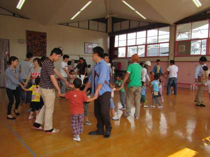 ゆり組(5歳児)は,親子でふれあい遊びでは,体と一緒にちょっと頭も使って遊びました。先生がタンバリンをならし,鳴らした数と同じ人数の人と手をつなぎます。「ぱん ぱん ぱん ぱん・・・・・ぱん 何回?」「8」・・・・お家の人のリードもあって,8人組もできました。