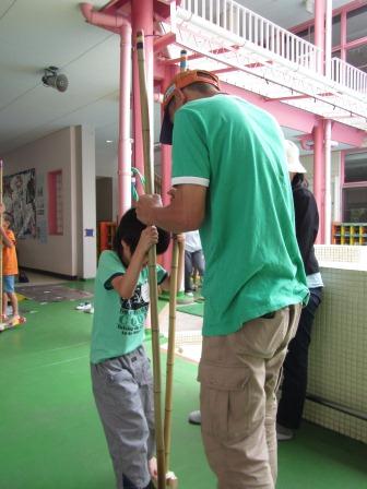 ゆり組(5歳児)は,つくってもらった竹馬に早速挑戦。お家の方に支えてもらってとても良い表情で取り組んでいました。幼児期ならではの親子のかかわりを大事にしたいと思います。