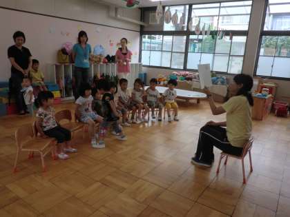 みんなで紙芝居を見ているところです。