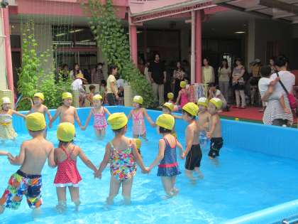 プールに入れないお父さんお母さんは「気持ちよさそうだね」と友達と一緒にかかわりながら水遊びをする様子を見てくださいました。