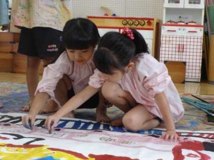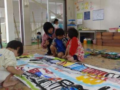 ゆり組(年長児)はみんなで大きな紙にトロッコ列車をかきました。