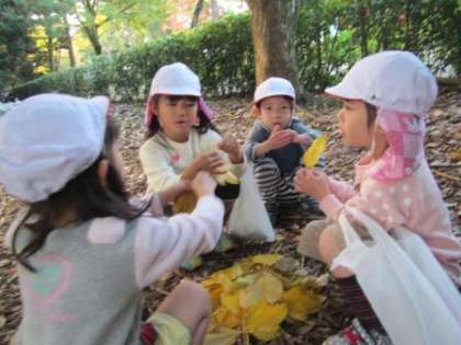 どんぐりや紅葉した落ち葉をみつけては,嬉しそうな子どもたち。