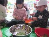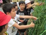 今年は豆がよくなりました。幼稚園のえんどう豆の収穫です。ゆり組(5歳児)が収穫しています。えんどう豆で豆ご飯をつくって食べましょうね。