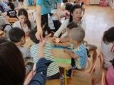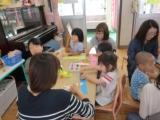 子どもたちは,パスでトントン,クルクル,サッサッと好きな線や点をかき,おうちの方がかたつむりの目?つの?をはりました。できたカタツムリは早速,壁に貼ってもらっていました。おうちの方も,わが子の様子とほかのお子さんの様子を見ながら,「案外ちゃんとするものですね・・・」と嬉しそうにしていました。