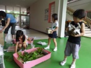 すっかりきれいになったウサギのゲージにウサギの大好物のブドウの葉っぱを入れています。そして,写真右の男の子は,お掃除の間,今日はウサギを抱っこしておくのが仕事だったようです。この抱き方は,ウサギにはちょっと苦しいのですが,赤ちゃんを抱くように,顔を覗き込んだり,体を揺らしたりしながら,お掃除が終わるのを待っていました。