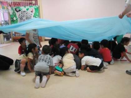 みんなでつくったクラゲを眺めながら,子どもたちもクラゲになって遊びました。母さんクラゲの周りに集まった子どもクラゲたち。