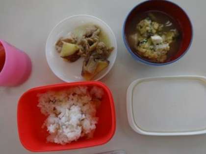 今日の幼稚園ランチは,子どもたちが掘って取ったさつまいもを使って,「さつまいもごはん」と「さつまいもと豚肉のたいたん」と「すまし汁の卵とじ」を作りました。子どもたちは,食欲旺盛で,何杯もおかわりする子もいて,おいしくいただきました。