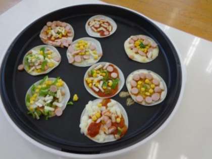 今日の預かり保育はおやつ作りでした。ピザを作りました。はじめに餃子の皮の生地にピザソースをつけました。次にウインナーとコーン、ピーマンをトッピングしました。最後にチーズをのせて出来上がりです。ホットプレートで美味しくパリパリにしました。トローととけたチーズとともにピザをみんなでいただきました。「美味しいね」「パリパリだ」と口々に言いながら、食べていました。