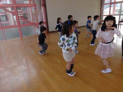今日の預かり保育はリズムダンス体験でした。始めにテンポのいい音楽に合わせて、飛んだり、足を開いたり、閉じたりしました。次にステップを横に並んでしました。先生に踊るコツを聞いて「先生は腰を動かしている」「肩を動かしている」姿をまねようとしていました。最後に優雅な曲に合わせて、3拍子のワルツのステップをしました。先生と2人で踊りました。先生と二人で踊るのがうれしい子どもたちです。