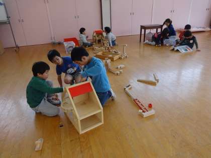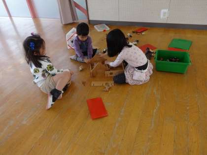 おやつのあとは、ビー玉でピタコラスイッチで遊んだり、ドールハウスで遊んだりしました。絵本の読み聞かせもありました。「ねじ」の本や「ピーターとおおかみ」紙芝居「まことくんとおかし」を読みました。「ねじ」の本が面白いようでした。
