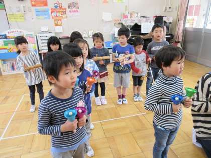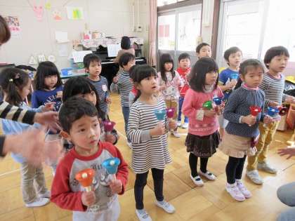 16日の預かり保育はリズムランドでした。この日は年長さんの最後の預かり保育でした。始めにお誕生日のうたを歌い、みんなで、自分のお誕生日の確認をしました。次に「かごめかごめ」をしました。「後ろの正面だあれ?」でお友達を上手にあてていました。絵本は「さよならなんてだいきらい」を読んでもらいました。おもわず、涙が出た先生に、子どもたちも「あ、なみだだ」と言いながら、感慨深く見ていました。最後に「さいいんようちえんのえんか」をハンドベル、トライアングル、ウッドブロックで合奏しました。みんな、一生懸命、演奏していました。リズムランドの後は、おやつを一緒にいただきました。カラー積み木やブロックで遊んだり、編み物を完成したりしていました。