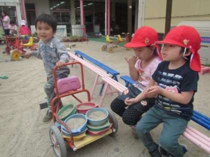 写真の三輪車は貨物列車のようです。荷物をたくさん運んでいます。待っていたお友達に運んできた砂のごちそうを渡して,とてもうれしそうです。