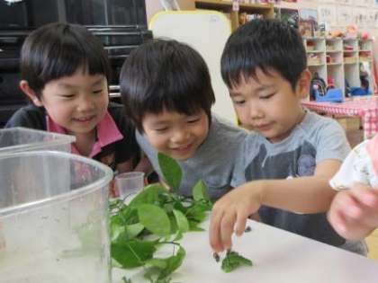 どのアオムシが大きいか・・・・何匹いるのか・・・・並べて比べていました。実はもうすでにさなぎになったアオムシもいて,子どもたちによると「8人家族」でした。