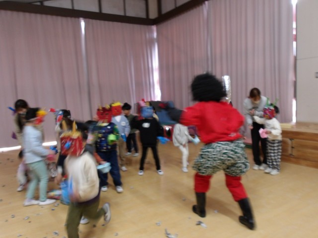 今日は節分、幼稚園のみんなで節分の集いをしました。節分クイズをしながら、節分の由来や風習について知りました。さぁ、みんなで豆まきをしよう!としたその時、2匹の鬼が!!みんなで新聞のお豆を「鬼は外!福は内!」と一生懸命まきました。ちょっとドキドキしたけれど、鬼は無事に逃げていきました。節分を過ぎるといよいよ春が来るそうです。みんなで元気に毎日過ごしたいね。