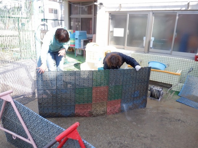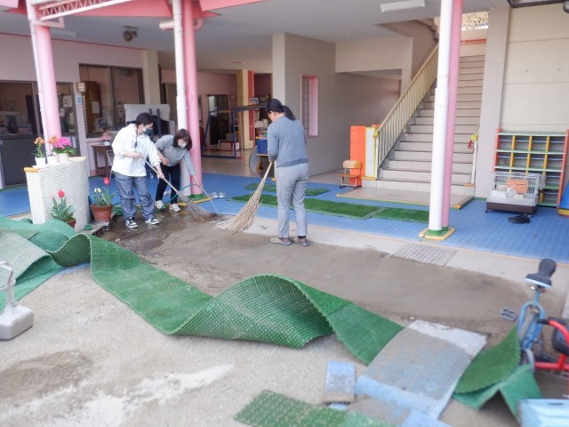 子どもたちが登園する前に、幼稚園をきれいにしています。