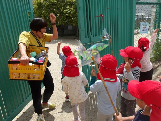 憧れの5歳児の風車を見て、「私もくるくる回るの、つくりたい!」とずっと思っていた4歳児。これまで、お化け探検ごっこで使ってきた”きらきらめがね”を今度は風車に大変身させ、いざ、みんなで隣のグラウンドに「しゅっぱーつ!しんこう!」