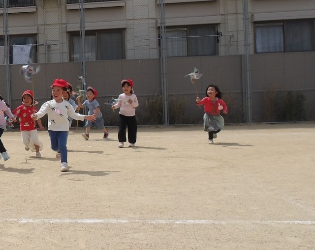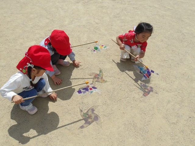 園庭の何倍の広さもある隣の小学校のグラウンドを入ったとたん、一斉に走り出す子どもたち。そのうち回すだけでなく、「見て!」「きれい!」と地面に映し出される風車の鏡の美しさも発見!最後はみんなで「3・2・1・それ~!」と心も体も存分に動かし風車を回して遊びました。
