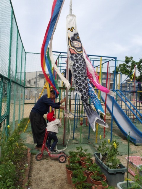 いつも5歳児が揚げてくれる鯉のぼりも、今日は4歳児が初めて揚げてみました。先日クレパス遊びを楽しんだ紙が、次は鯉のぼりに大変身!