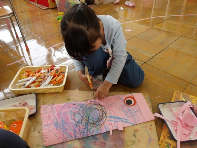 「できた!私の鯉のぼり見て!いいでしょ」と風車に続き、鯉のぼりもできてきています。お化け探検ごっこ、クレパス遊び、風車遊び、鯉のぼりづくり…毎日、いろいろな遊びを楽しみながら、今ならではの季節を感じられる遊びともつなげ、これからもみんなで楽しんでいきたいです。