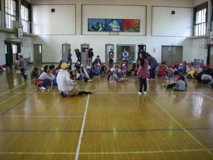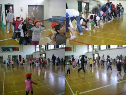 11月6日土曜日板橋小学校体育館において板橋ふれあい土曜塾推進事業「リクリエーションゲーム」が開催されました。伏見板橋幼稚園PTAとサンサンパパ(おやじの会)の皆さんが中心となって「追いかけ玉入れ」「玉入れ競争」「ボールおくり」「しっぽとり」など体を動かして楽しく遊ぶゲームをしました。幼稚園児小学生お父さんお母さんたちがたくさん参加して「ふれあい」をふかめました。