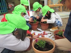 今日は年中・年長組で苗・球根を植えました。年長ゆり組ではチューリップとビオラを植木鉢に植えました。ふかふかの土をたっぷりしいて,優しく植えます。年中さくら組は,いちごの苗を植えました。植えた後はしっかり水やりもしましたよ。今,保育室ではきれいな花が咲いたサフランや芽を出し始めたクロッカス,水栽培を始めたばかりのヒヤシンスなども育てています。生長が楽しみだね。