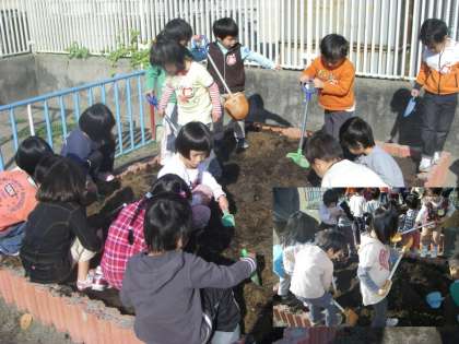 3歳児が新しくできた花壇を耕しました。そしてパンジーを植えました。