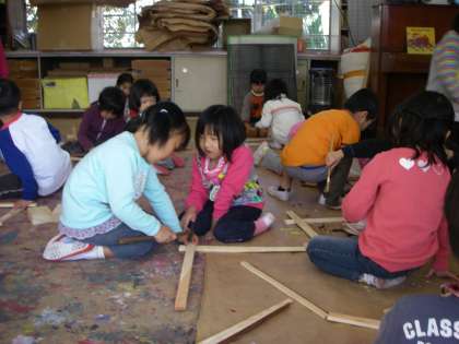 5歳児が木工遊びをしました。根気強く丁寧に釘を打って木と木をつなぎ合わせ、友達と力を合わせて機関車の線路を作っている子もいました。力を合わせ互いのアイデアを出し合って楽しく製作していました。