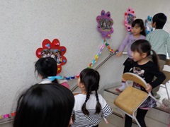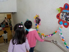 ゆり組が遊戯室から出てきて階段へ向かうと…なんと階段に素敵な飾り付けがしてありました。実はさくら組の子どもたちが,修了するゆり組のためにみんなで輪つなぎや写真を飾ってくれていたのです。ゆり組の子どもたちも驚きと嬉しさでにこにこしていました。さくら組の子どもたちと一緒に見たり,「すごいね!」と伝えたりする姿がありました。飾り付けは大成功!喜んでもらえた嬉しさを全身で表現するさくら組でした。