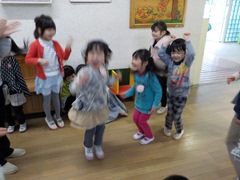 修了式に向けて朝から遊戯室で頑張る年長ゆり組の子どもたち。その様子を,そっとうかがう年中さくら組の姿がありました。ゆり組の方を見ながら,保育室へ向かう階段で何かをしているようです。