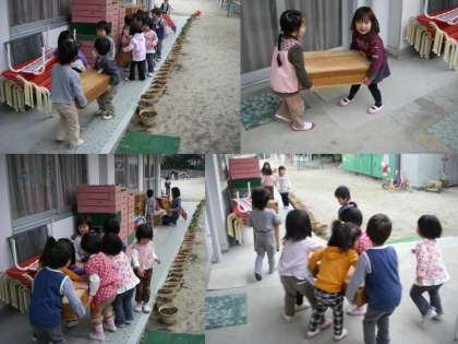 昨日で園内展はおしまい。明日は「楽しいつどい」です。3歳児が「楽しいつどい」のために積み木を運んでいます。友達と力を合わせて「よいしょ」と運びました。