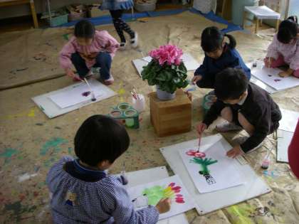 5歳児が「シクラメン」の絵をわりばしペンで墨汁とうすどき絵の具で描きました。こまかいところまでよく観察して丁寧に書きました。