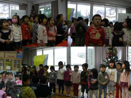 今日は2学期の終業式でした。3歳児が元気よく「サンタクロース」を歌っています。1番2番は日本語で3番は英語で歌いました。4歳児は「ねえサンタクロースのおじいさん」、5歳児は「うさぎ野原のクリスマス」を歌いました。22年度卒園対策委員さんからすてきな刺繍のテレビカバー遊戯室用園長室用2枚をいただきました。