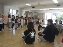 今日は、幼稚園の一番大きなお兄さん・お姉さんのゆり組と、未就園児こっこ組が一緒に遊びました。ゆり組の歌を聞いてもらったり、なかよし遊びをしたり、ダンスを踊ったり…。かわいいこっこ組の子どもたちと、優しいゆり組の子どもたち、そしてにっこり見守るお母さんの姿がありました。