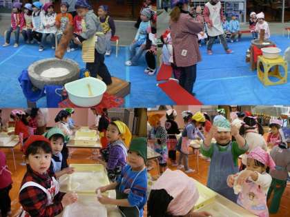 今日は子どもたちが楽しみにしていたおもちつきです。大きな杵をよいしょと持ち上げ、お餅つきをしました。3歳児もがんばってつきました。4歳児が自分のついたおもちを丸めています。こんなに伸びるよと見せています。