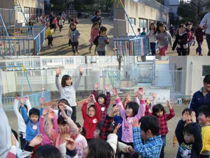 マラソンで走った後は学年ごとに集まって整理体操をしています。4歳児の整理体操の様子です。